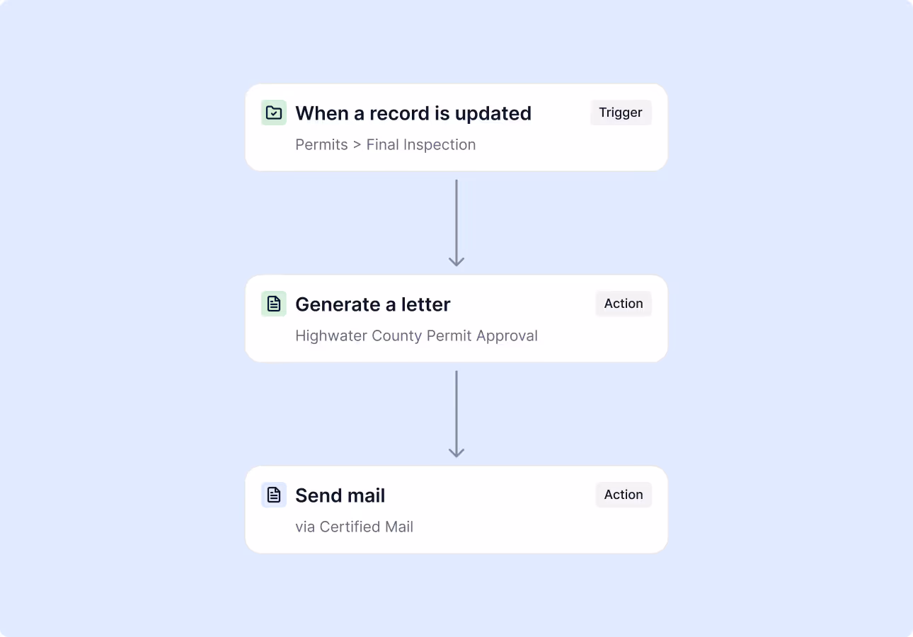 Mailings can be triggered by key actions like inspection completion, violations, or due dates.