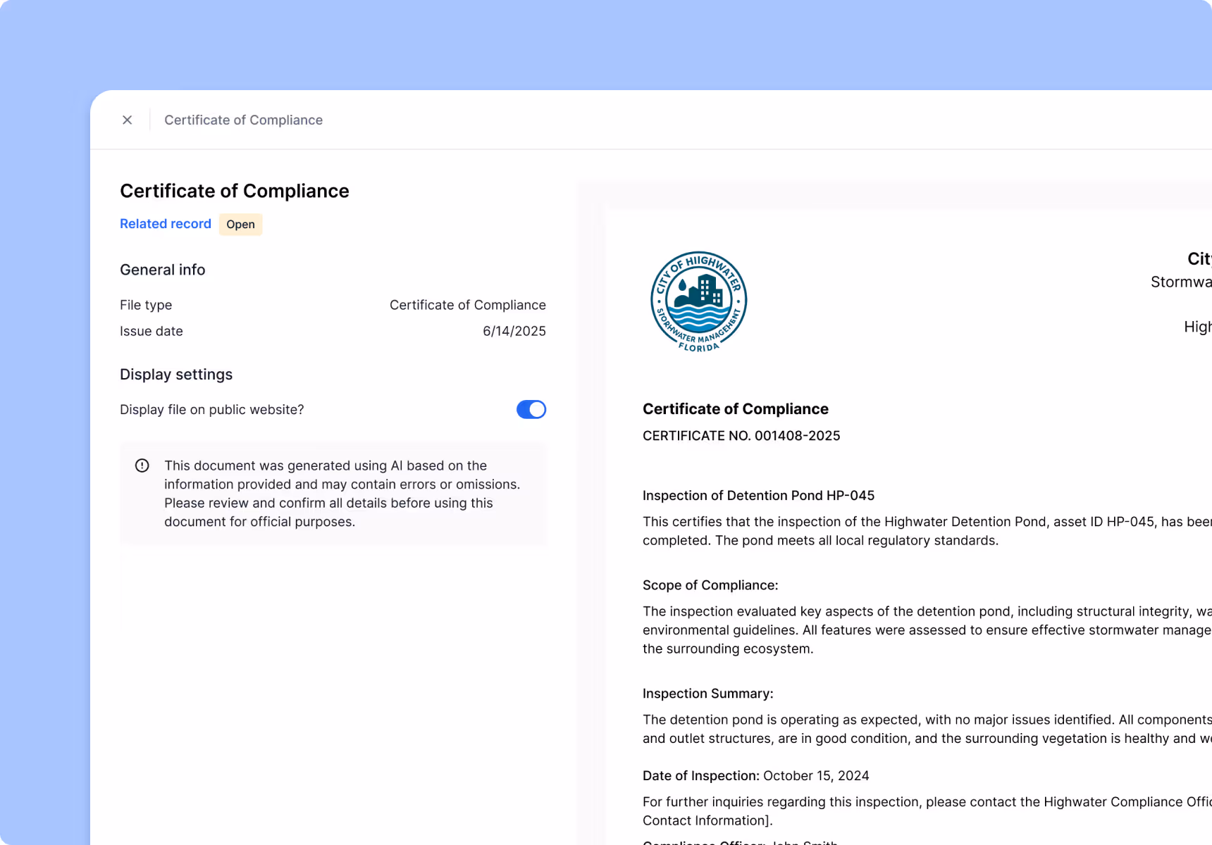 Generate standardized inspection summaries, maintenance reports, and notices in a few clicks. Quickly gather records needed for audits, funding applications, or compliance requirements.