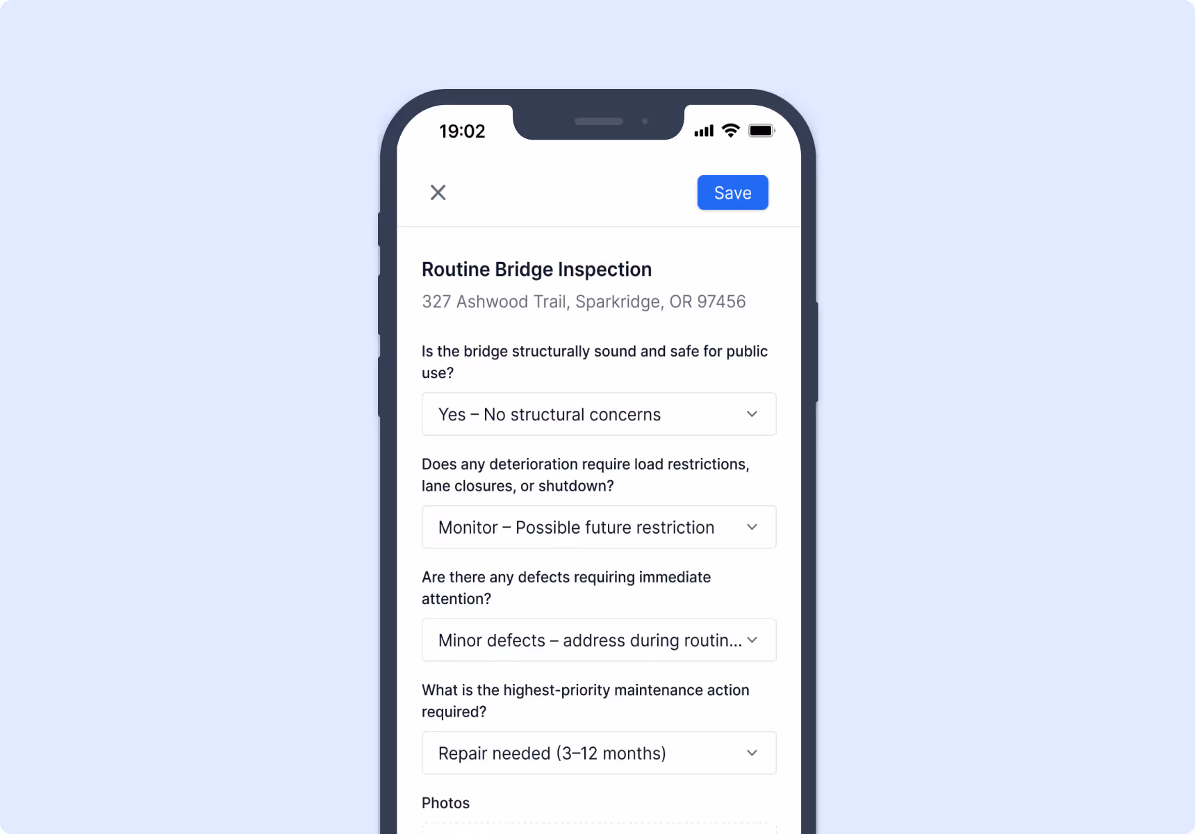 Use custom inspection forms to capture condition data consistently across asset types. Attach photos, document defects, and create reliable records for long-term planning.